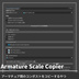 Avatar Batch Copier(体型合わせ) 改変したアバターの体型を衣装側にも同じ調整を適用したい場合などに便利です。 1. Tools → Armature Scale Copier → Avatar Batch Copier でツールウィンドウを開く 2. 検索範囲にアバターをドラッグ&ドロップ 3. コピーしたいコンポーネントを選択 (MA Scale Adjusterをオン) 4. ペーストさせたい Armature オブジェクトをチェックボックスで選択 5. コピーを実行 ※一部体型では手直しが必要な場合があります。 Single Copier 単体のみの適用などで使用します。 1. Tools → Armature Scale Copier → Single Copier でツールウィンドウを開く 2. コピー元の Armature オブジェクトを選択 3. 「Copy Armature Data」ボタンでデータをコピー 4. コピーしたいコンポーネントを選択 5. コピー先の Armature オブジェクトを選択 6. 「Paste Armature Data」ボタンでデータをペースト